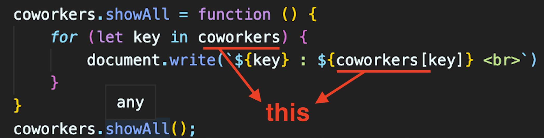 document.write(`${key} : ${coworkers[key]} <br>`)